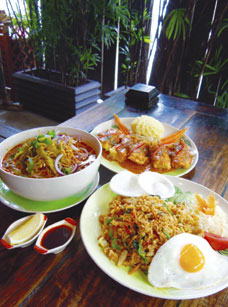 写真上/おすすめ!人気メニュー。手前:ナシゴレン、ご存知バリの焼き飯。左:カオソーイ950円、タイ・チェンマイ名物のココナッツカレー麺。マイルドながらピリッと辛いスープが旨い! 奥:チューチープラー1,000円、揚げ魚に濃厚なココナッツカレーソース。